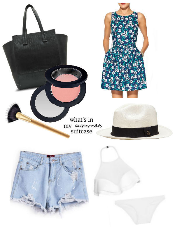 With so much traveling this month, I am getting really good at my go-tos for summer trips. Since I am also traveling for work, my large black purse that also fits my lap top is a huge staple piece for me. I seem to always have a printed dress with short or no sleeves tucked into my bag for nights out. Next, on my list is coral/pink blush and a fan brush. The fan brush let's you apply the blush right on your cheekbones for the right amount of color. A fedora is something I actually haven't brought on a trip yet, but after being in Chicago where I think three out of my six friends had one I think I'll have to add this to the list. It's a easy way to keep sun out of your face when you're touring around. I won't lie those, these are a pain to pack, so carry it on the plane with you. A pair of cut off jeans shorts are my go-to for casual touring around a city that you can wear with a cute top or as a cover up over a bathing. This white bathing suit, I LOVE with it's ruffled top and simple bottoms.