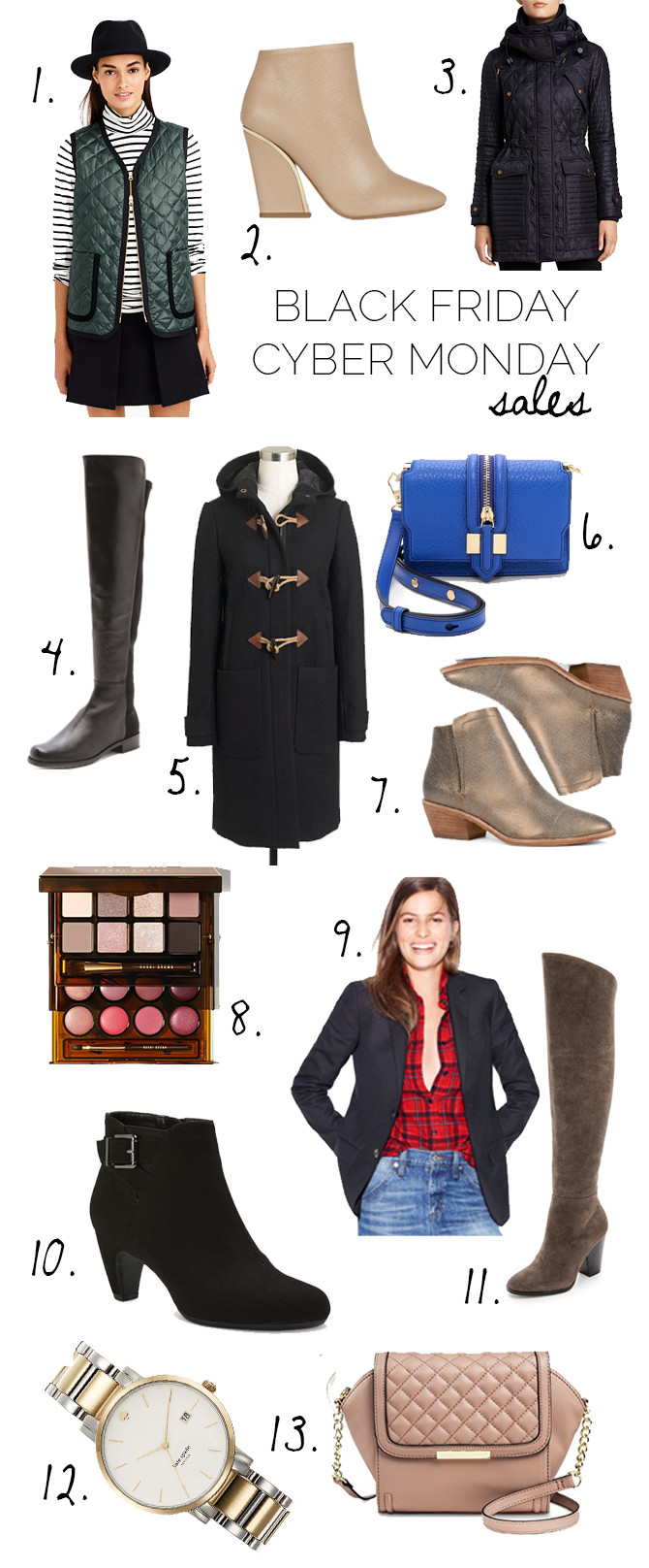 1. Quilted V-Neck Vest // 2. Chloe Gold Trimmed Ankle Booties // 3. Burberry Brit Bosworth Quilted Patchwork Coat // 4. Stuart Weitzman 5050 Flat Boots // 5. Factory Toggle Coat // 6. Mini Waverly Cross Body Bag // 7. Jodi Booties // 8. Bobbi Brown Deluxe Eye + Lip Palette // 9. Women's Ludlow Blazer // 10. Sam and Libby Ankle Booties // 11. Sleek Suede Over The Knee Boot // 12. Kate Spade Gramercy Bracelet Watch // 13. Crossbody Quilted Handbag